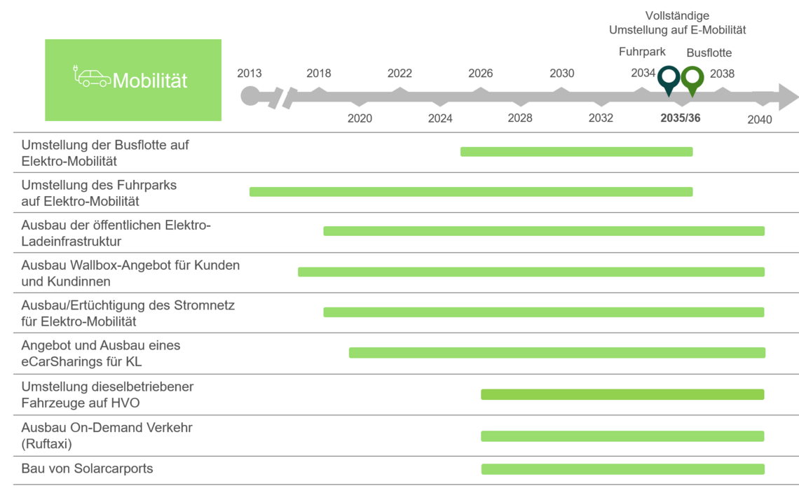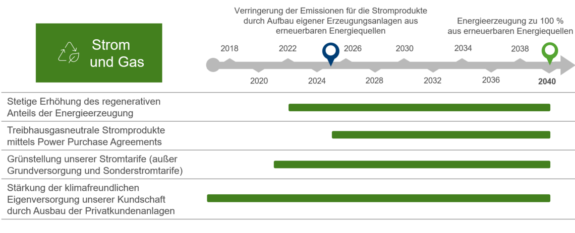 Um unser Ziel der bilanziellen Treibhausgasneutralität bis 2040 zu realisieren, nimmt der Klima- und Umweltschutz in all unseren Geschäftsfeldern und Unternehmensentscheidungen eine zentrale Rolle ein. Darüber hinaus verfolgen wir in fünf Handlungsfeldern konkrete Ziele und Maßnahmen.
