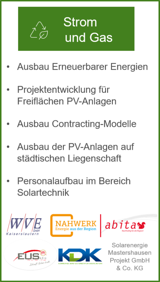 Über 65 % unserer derzeitigen Emissionen entstehen durch die Versorgung Kaiserlauterns mit Strom und Gas. Um das in Zukunft zu ändern, zielen wir in diesem Handlungsfeld auf den Ausbau der Energieerzeugung aus erneuerbaren Quellen ab – bei uns und unseren Kunden und Kundinnen.