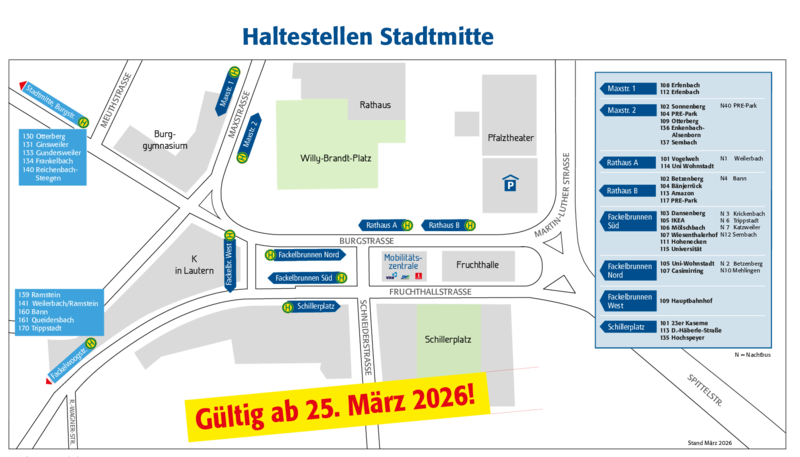 Always find the right bus stop. The bus stop map gives you a view of all the platforms in the city center of Kaiserslautern.