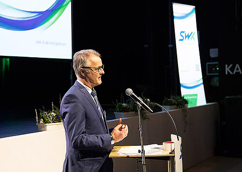 Markus Vollmer, Vorstandsmitglied der SWK Stadtwerke Kaiserslautern, umriss die Rolle der Stadtwerke bei der Energiewende. „Wir sind der Motor der Energiewende. Wir setzen die Projekte vor Ort um und betreiben mit unseren Netzen die Infrastruktur der Energiewende.“