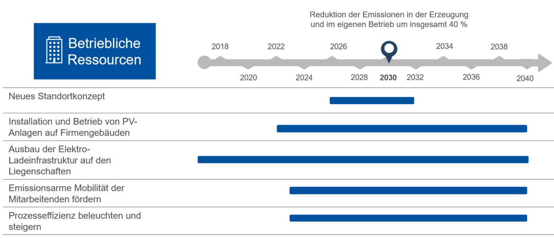 Unser Anspruch ist es, die Treibhausgasneutralität vor allem durch die Reduktion und Vermeidung von Emissionen zu realisieren. Lediglich nicht vermeidbare Restemissionen sollen durch Kompensationen ausgeglichen werden. Dafür wollen wir dort wo möglich, unsere Energieerzeugung bis 2040 zu 100 % auf erneuerbare Energiequellen umstellen, unsere eigene Ressourceneffizienz in betrieblichen Prozessen steigern und die Emissionen in allen vor- und nachgelagerten Prozessen systematisch reduzieren.