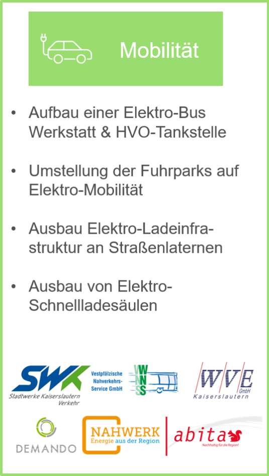 In diesem Handlungsfeld bringen wir Kaiserslautern mit Elektro-Mobilität auf Fahrt. Das umfasst den öffentlichen Nahverkehr, unser eCarSharing Emil und die Fahrzeuge in unserem Fuhrpark.